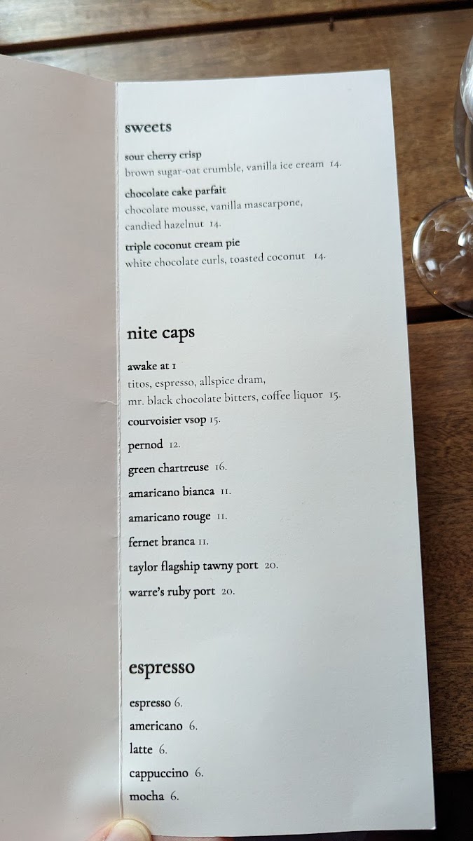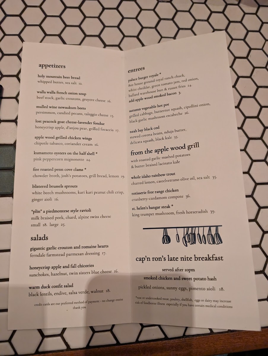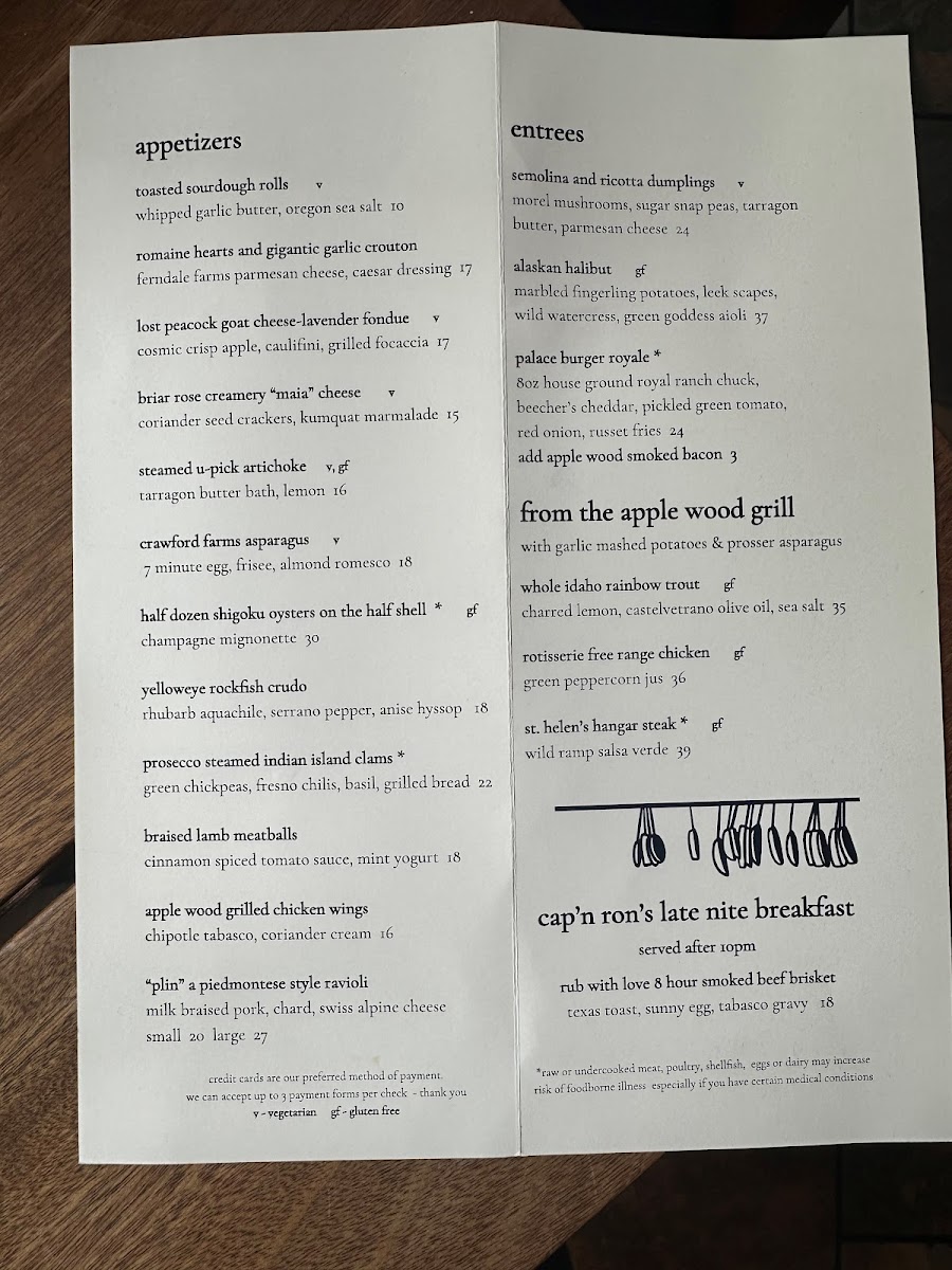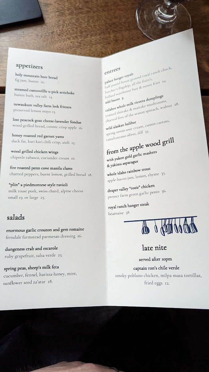 For the main event, don't miss the Large "Plin" Ravioli, stuffed with milk-braised pork and Swiss alpine cheese, or the perfectly cooked rockfish, both priced at $32 and highly praised by regulars. And if you have room for dessert—which we suspect you will—treat yourself to the Coconut Cream Pie for $16 or indulge in a scoop of their refreshing Passion Fruit Sorbet for only $10. Each dish is crafted with intention, using fresh local ingredients that pay homage to the vibrant Pacific Northwest.